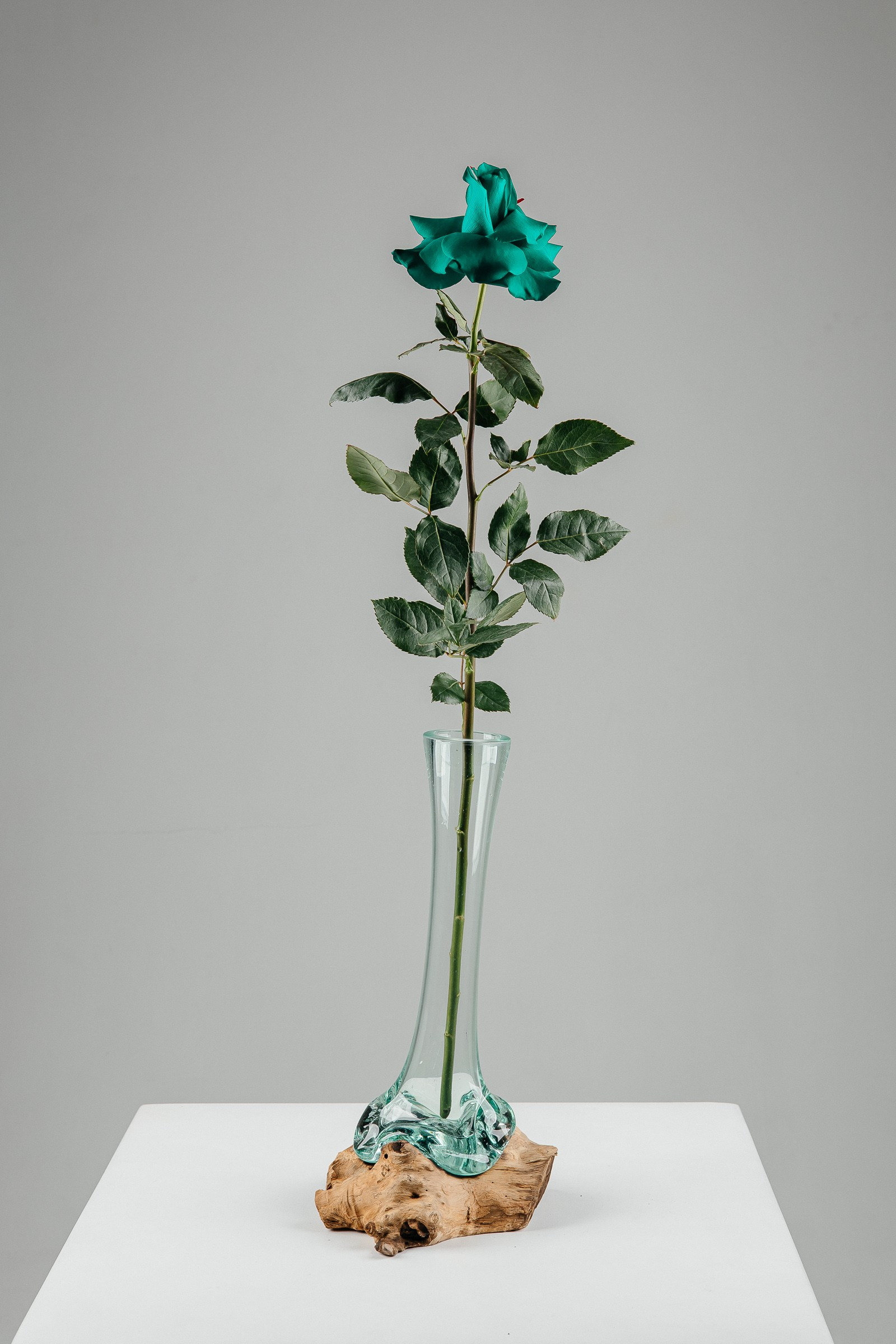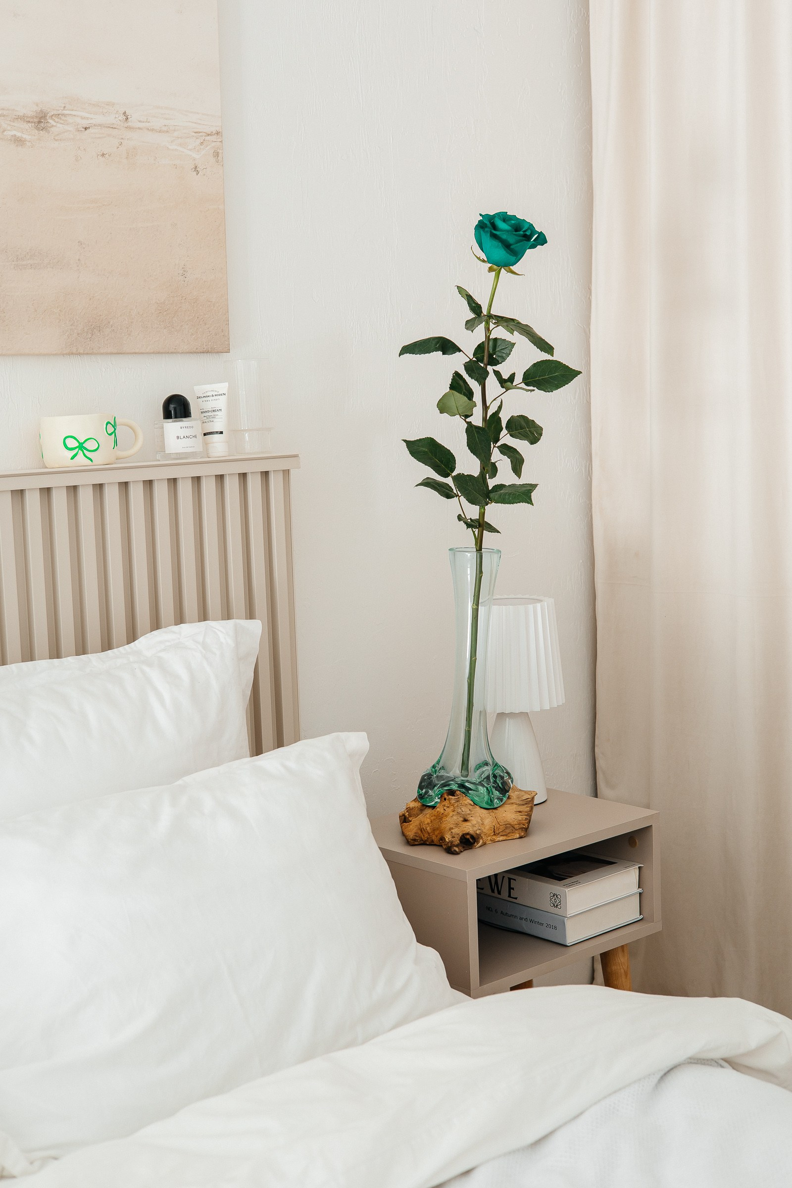 В этот раз нам так понравилось, как ваза смотрится на белом столе и на сером фоне, что решили так и оставить. И, конечно, добавить немного интерьера.